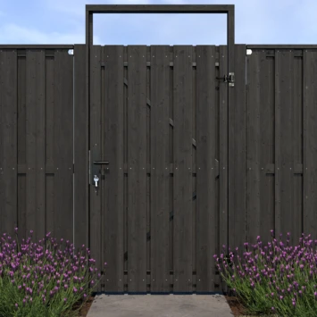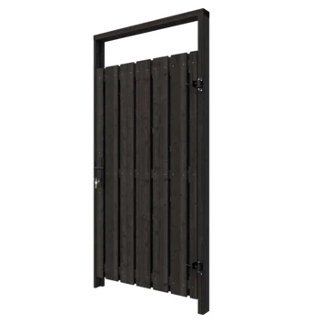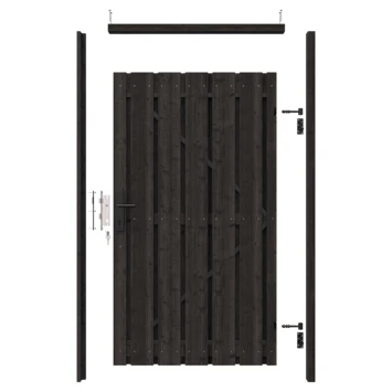 De tuindeur recht grenen geschaafd geïmpregneerd en gedompeld antraciet op zwart stalen frame is 180 cm hoog, 100 cm breed, 5,5 cm diep en heeft weinig doorkijk. De tuindeur bestaat uit 13 verticale planken die met RVS schroeven op een zwart stalen frame zijn vastgemaakt. De tuindeur is tweezijdig, kan zowel links- als rechtsdraaiend gemonteerd worden en wordt inclusief hengen geleverd.